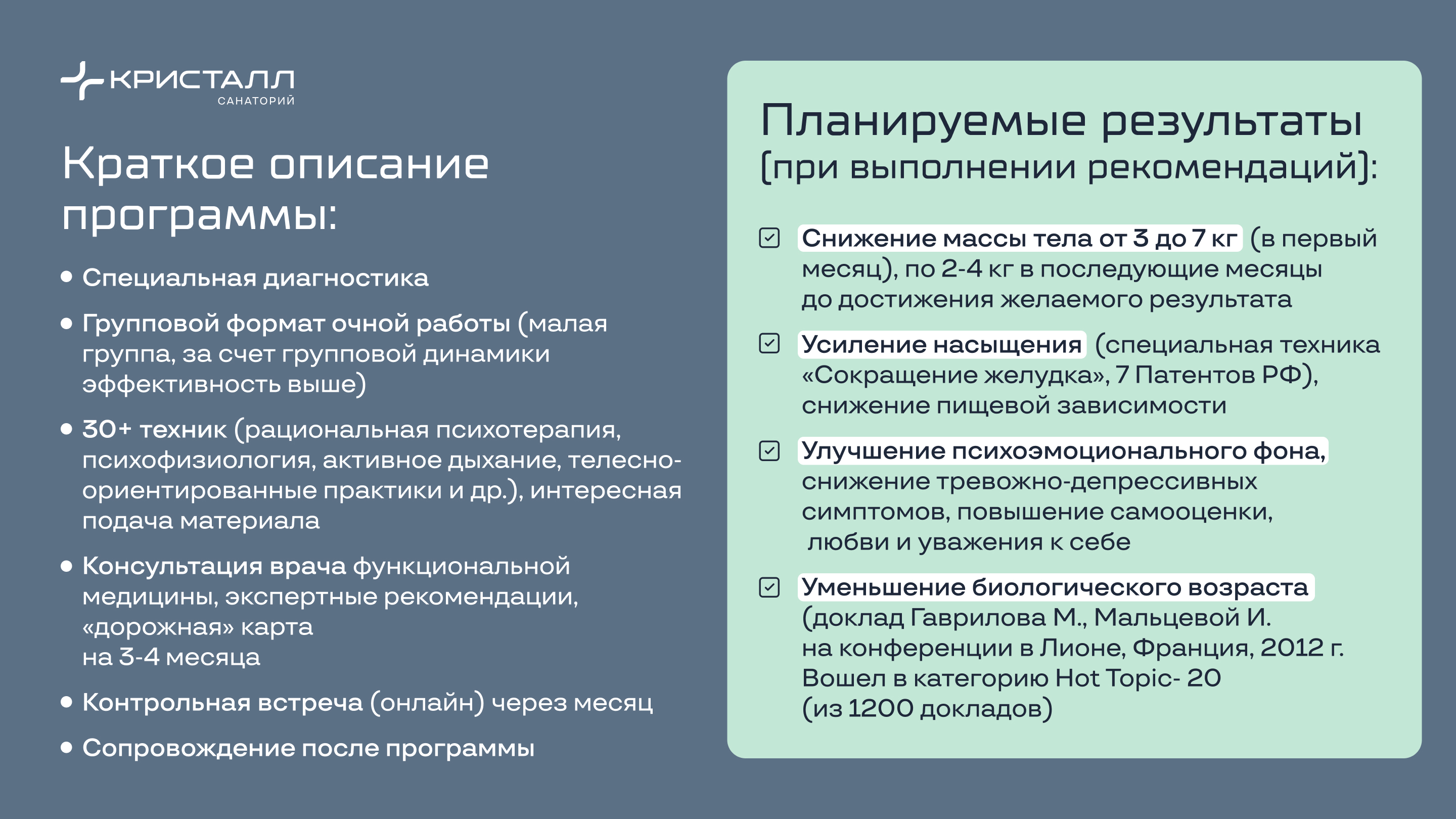 Три эксперта Центра доктора Гаврилова и команда превентивной медицины санатория «Кристалл» будут работать над уникальной психологической и телесной трансформацией организма.
